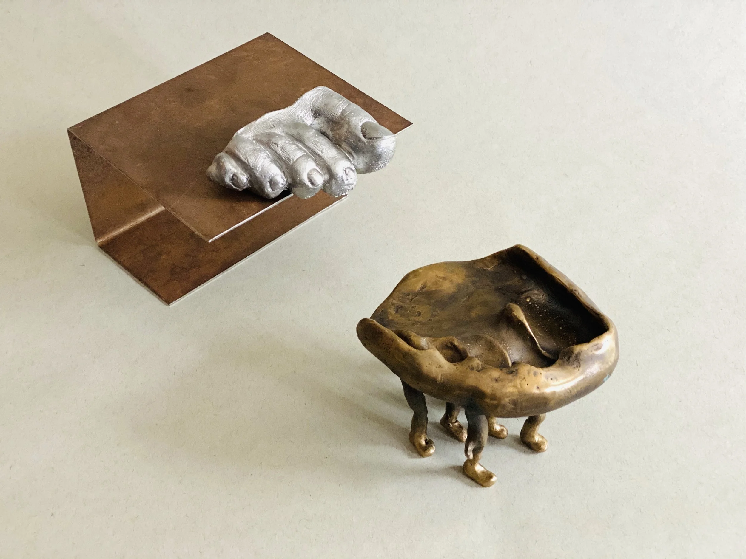 A segment of a foot made of cast aluminum, a footprint of the same foot, made of cast bronze, and a bent steel sheet plinth. The aluminum foot fits snuggly into the bronze footprint. The footprint, with its many tiny legs underneath it, is wobbling away. The foot, poised to jump from its plinth, may hit its target and fall into place into the footprint. Or will it miss? One feels compelled to complete the narrative sequence and place the aluminum foot into the bronze footprint. The pieces almost click together, and one feels a sense of completion in allowing the foot to finally catch up with the runaway footprint. But the steel plinth suggests rather an arrested motion, barring any conclusion to the suggested sequence and leaving the question of catching up with one’s footprint unanswered.